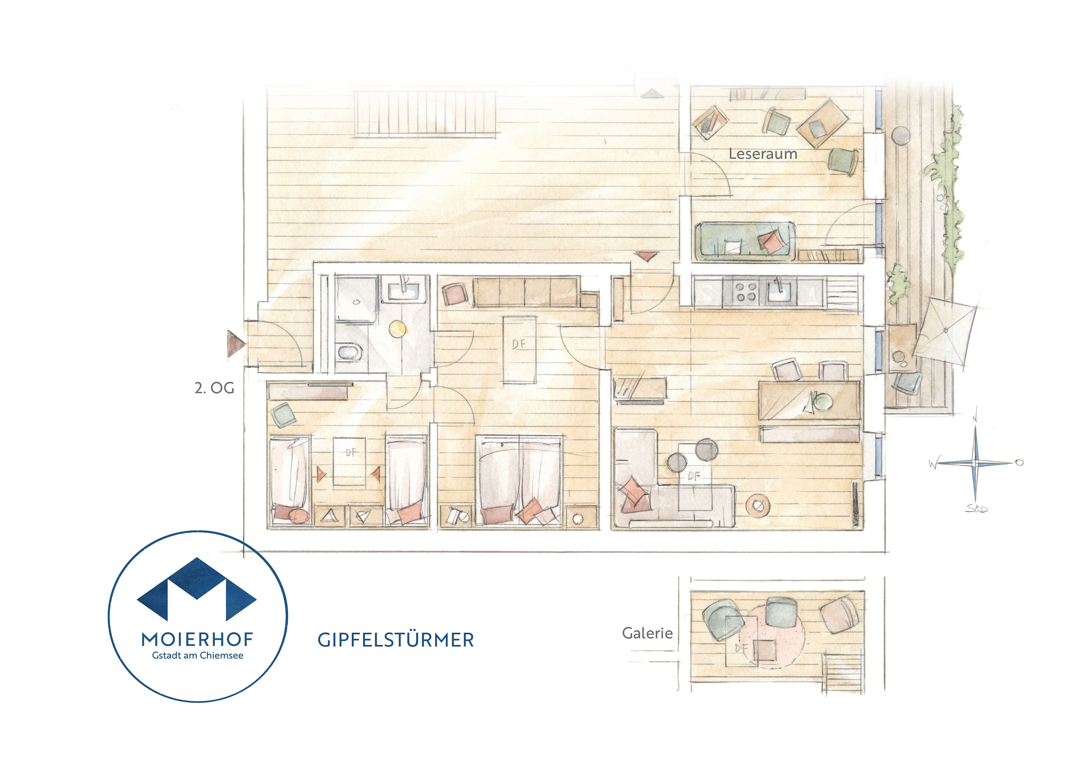 In der komfortablen 5-Sterne-Ferienwohnung „Gipfelstürmer“ sorgen viele durchdachte Feinheiten für ein harmonisches Wohlgefühl. Bis zu vier Personen finden hier im zweiten Obergeschoss des Wohngebäudes auf der Süd-Seite ein echtes Urlaubs-Feeling. Der freundliche Wohn- und Essbereich mit stilvoller Galerie und der möblierte Ost-Balkon bieten zahlreiche gemütliche Rückzugsorte zum Entspannen. Zwei Schlafzimmer mit direktem Zugang zum Badezimmer runden den Luxus dieser Ferienwohnung ab. Darüber hinaus schließt sich direkt an diese Ferienwohnung ein Leseraum an, in welchem spannende Literatur in gemütlicher Umgebung verschlungen werden möchte.