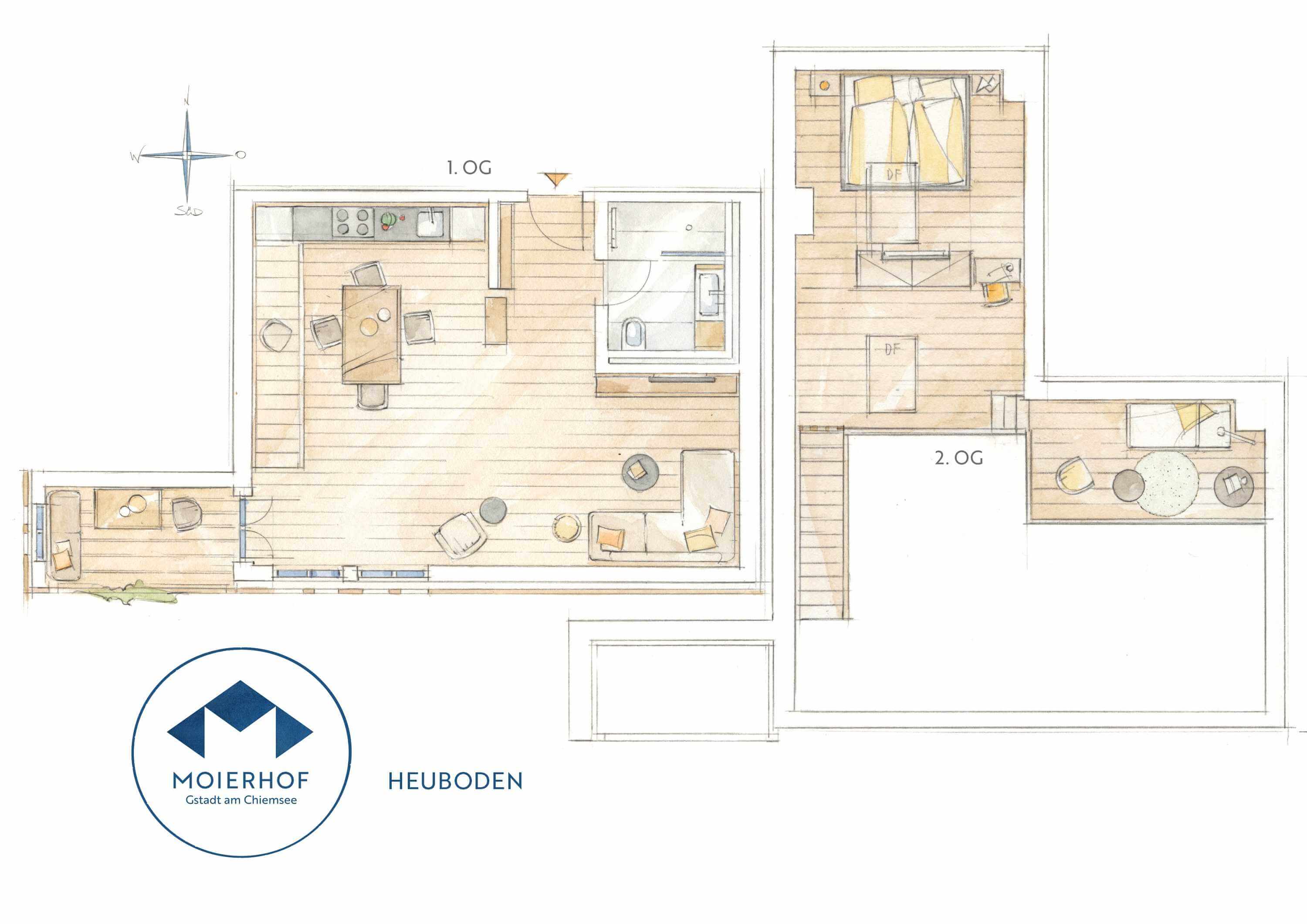 Willkommen auf dem alten Heuboden über dem ehemaligen Gewölbestall am Moierhof Gstadt. In den beiden nach der Sanierung entstandenen Obergeschossen über dem alten Gewölbestall befindet sich heute die luxuriöse 5-Sterne-Ferienwohnung „Heuboden“. Sie ist auf geräumigen 82 qm ein wahres Paradies für zwei Personen. Neben den gemütlichen Wohn- und Essbereichen lässt es sich in der Sonne auf der nach Süden offenen möblierten Loggia wahrhaft relaxen. Nach einem aktiven Tag in der Sonne geht das Entspannen auf der heimeligen Galerie mit Relax-Liege im Dachgeschoss gemütlich weiter. Ein Wohlfühl-Schlafzimmer im Dachgeschoss, ein Wohlfühl-Badezimmer sowie das durch die behutsam in das alte denkmalgeschützte Fachwerk verbauten Naturmaterialien erzeugte Wohlfühl-Klima machen die gesamte Ferienwohnung zu einem einzigartigen Erlebnis.