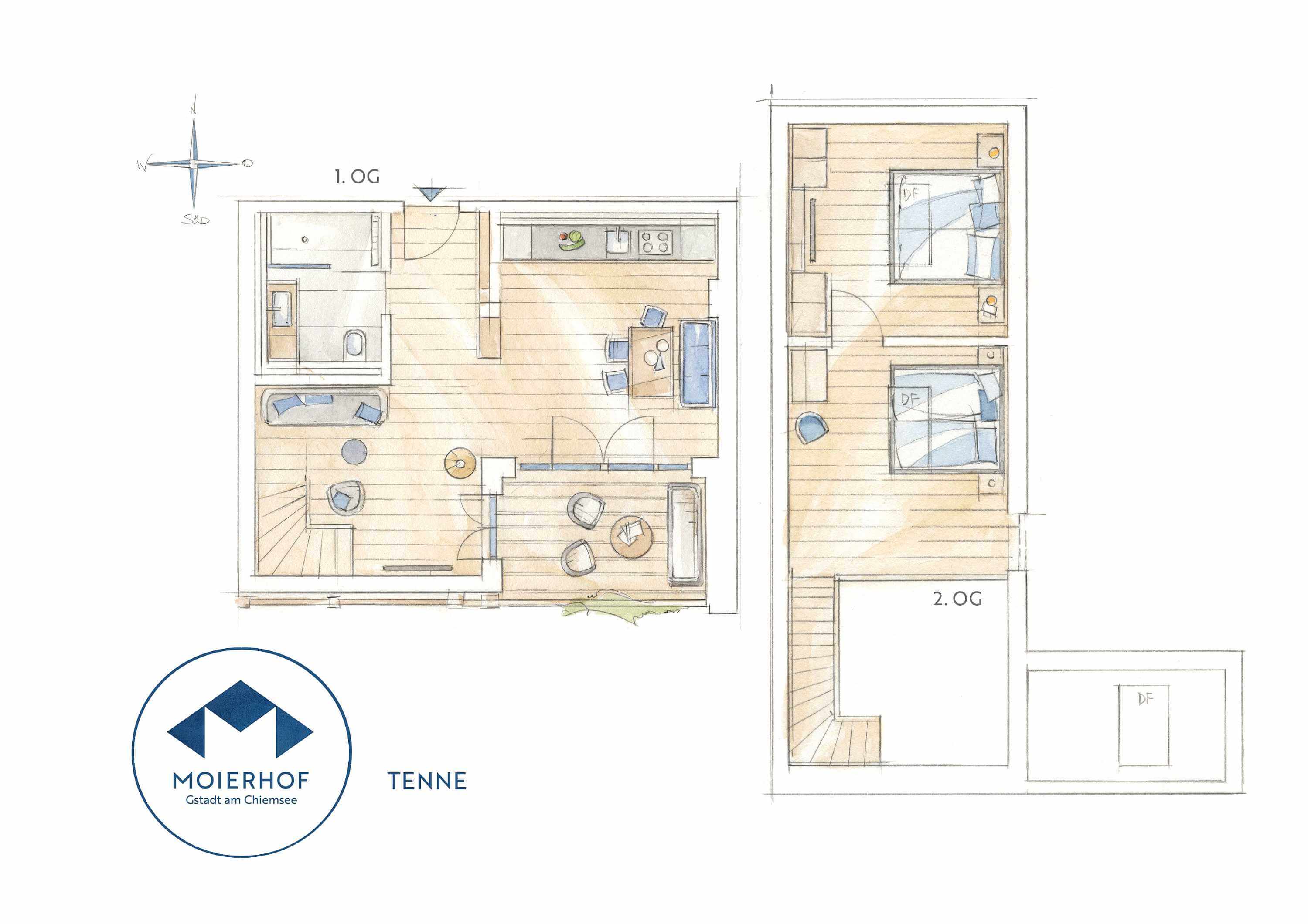 Über zwei Etagen im Obergeschoss des alten Gewölbestalls erstreckt sich die 5-Sterne-Luxus-Ferienwohnung „Tenne“ am Moierhof Gstadt. Hier fühlst du dich in einem freundlichen Wohnambiente sofort wie zu Hause. In den zwei Schlafzimmern direkt unter dem Sichtdachstuhl finden bis zu vier Personen eine angenehme Rückzugsmöglichkeit zum Erholen. Viel Echtholz, das alte denkmalgeschützte Fachwerk, harmonisch abgestimmte Farben in der Einrichtung und edle Lichtelemente sorgen für ein wahres Wohlgefühl. Ein Highlight der Ferienwohnung ist die überdachte und nach Süden hin offene möblierte Loggia für romantische Sommerabende mit Chiemseeblick.